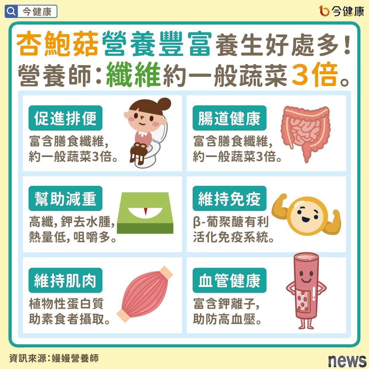 Low heat, protein quality: Manman Nutritionist said that apricot mushrooms have low heat, and 100 grams only has 40 calories. Contains 2.7-3 grams of protein, which helps maintain muscle mass, is beneficial to muscle building and fat loss. It is a very good plant-based protein choice for vegetarians. Because of its chewy texture, apricot mushrooms are often made into vegetarian meat and are also named "beef in the vegetarian world". Of course, if you want to supplement it, it is best to use beans such as yellow beans.