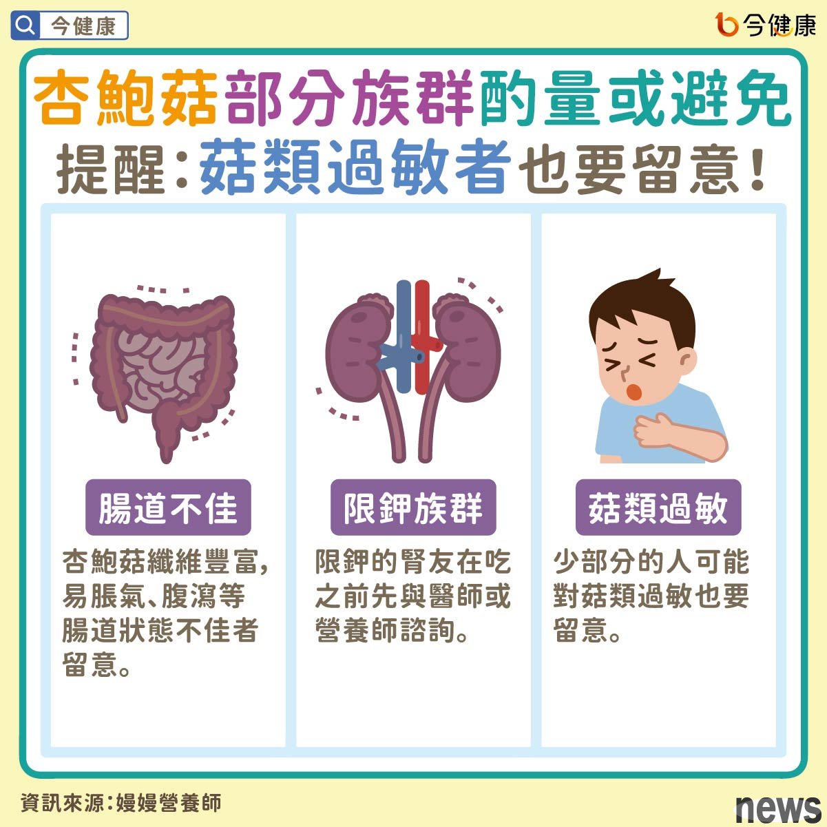 Although apricot mushrooms are good for physical health, a small number of people should take appropriate measures or avoid them. Manman Nutritionist said that apricot mushrooms are actually very rich in dietary fiber and ion. People with poor kidney tract status, prone to gastrointestinal, etc., or ethnic groups such as kidney restriction should naturally eat less, especially those with limited loads, who should still ask doctors or nutritionists before eating. Some people also have allergies to mushrooms, and they have to stop even if they are diagnosed with allergies.