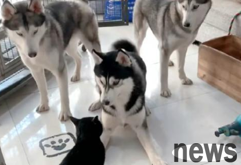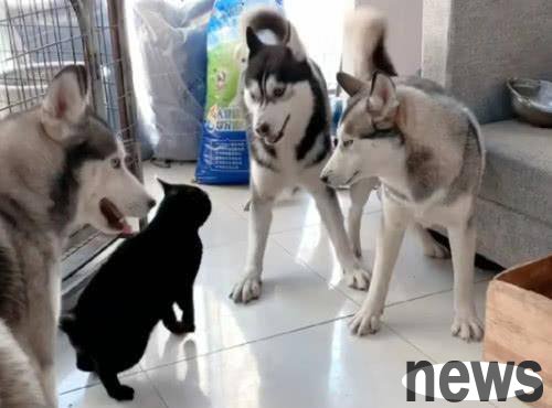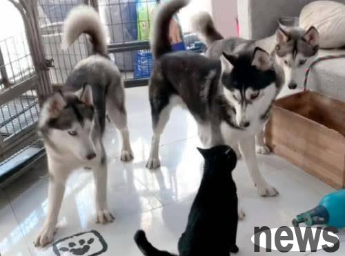 But the next scene made us laugh. We saw this black cat approaching three huskies tightly, but the three huskies slowly retreated into the corner. Moreover, the black cat's meow seemed to be about to attack. Seeing the cat's movements, we looked at each other, and now we were in for a good show. Unexpectedly, this cat treated the three huskies differently. It seemed that he especially targeted the one with a similar color to himself, while the other two huskies stood aside stupidly, watching their brothers being bullied. "Where is the old friendship? Treating your brother like this?"