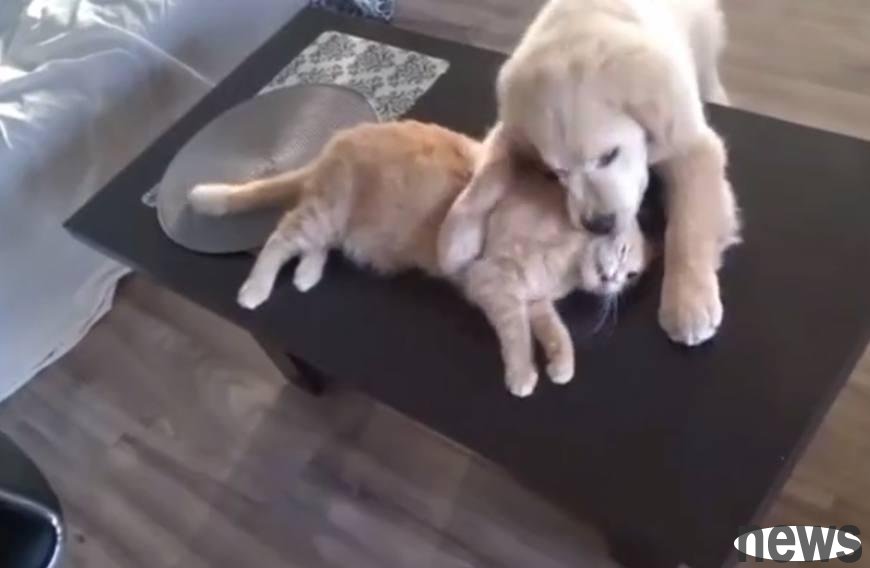 This golden retriever and the cat have grown up together, but the little golden retriever always bullies the kitten. As long as the golden retriever gets bored, he will pick up the kitten and learn to have fun. If you ask me, this is just because the cat is younger than you, otherwise it would have scratched your face. This is a sweet photo of a dog and a cat. The picture looks relatively harmonious, but the next second the golden retriever "showed its movement", opened its mouth and bit the cat's head.