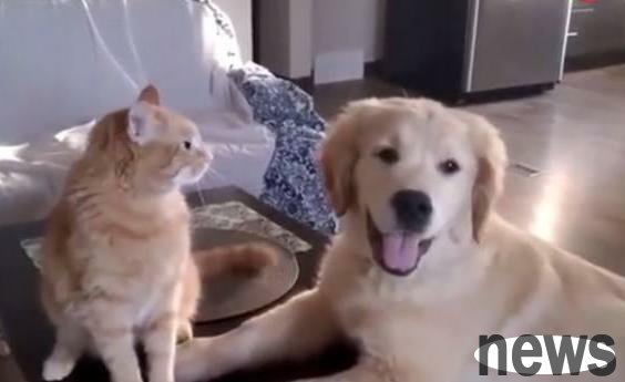 Golden Retriever: What are you doing? Brother Cat, I'm just kidding you, don't get angry, don't get angry, we are all our own people, woof woof woof. Cat: Go aside quickly and stop annoying me, or I will pluck your ears off. It was probably because the little golden retriever put the cat's head in its mouth and messed up the cat's hairstyle, which made the cat angry. After all, cats pay great attention to appearance.