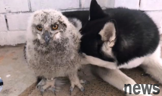 The husky had nothing to do at home, so he came to find the owl. Although he couldn't beat the dog, the owl didn't run away. Of course, it couldn't fly now.
