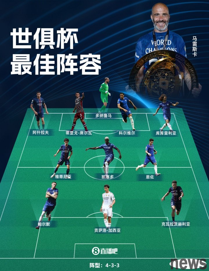 In the Club World Cup final this morning, Chelsea successfully won the championship 3-0. At this point, all the 2025 Club World Cup competition have ended. The editorial department selected the Best Team of the 2025 Club World Cup based on the players and team performance. Chelsea and Paris Saint-Germain were selected in the finals, with Thiago Silva and Gonzalo Garcia being included.