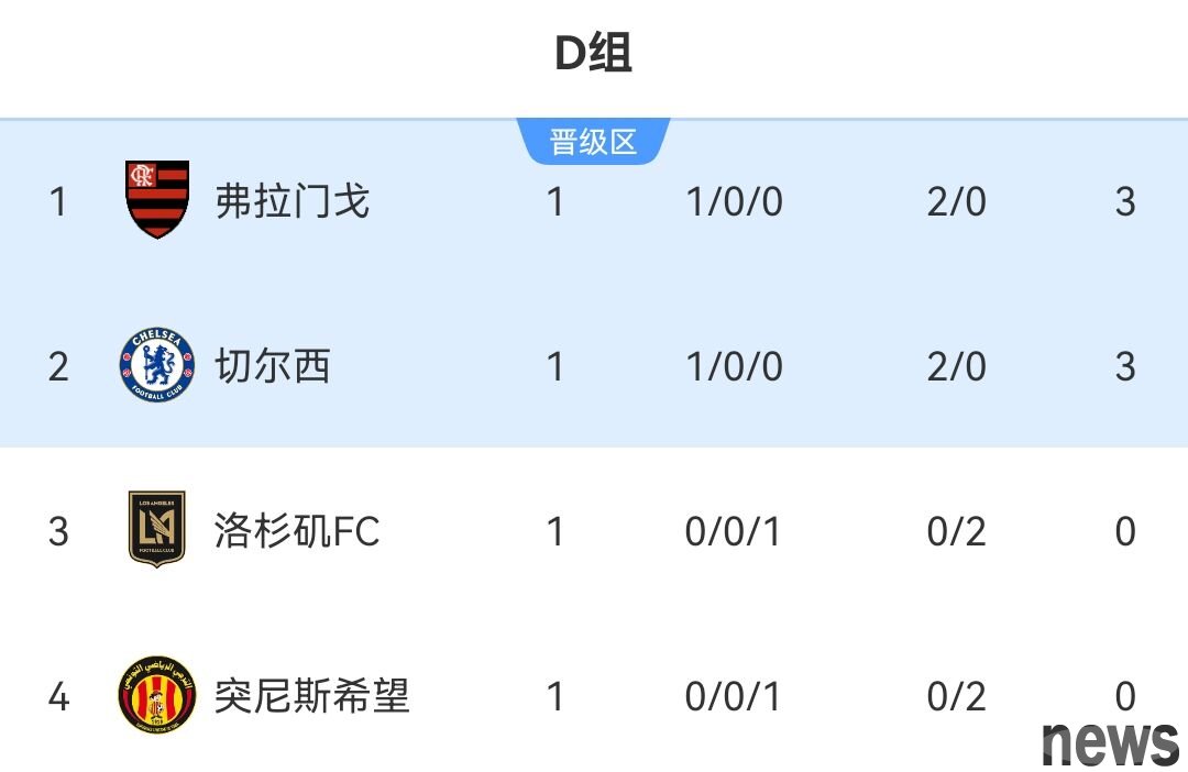 Club World Cup Group D ended in Group D, with Chelsea 2-0 Los Angeles FC, and Flamenco 2-0 Tunisia Hope. Currently, Flamenco is currently ranked first, Chelsea is second, Los Angeles FC is third, and Tunisia hopes to be the bottom....