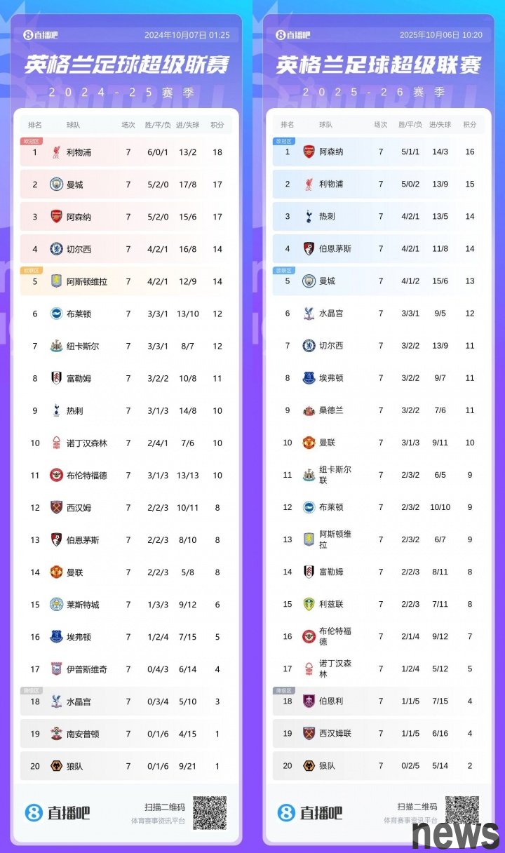 24/25 Premier League season and 25/26 Premier League season score standings after 7 rounds...