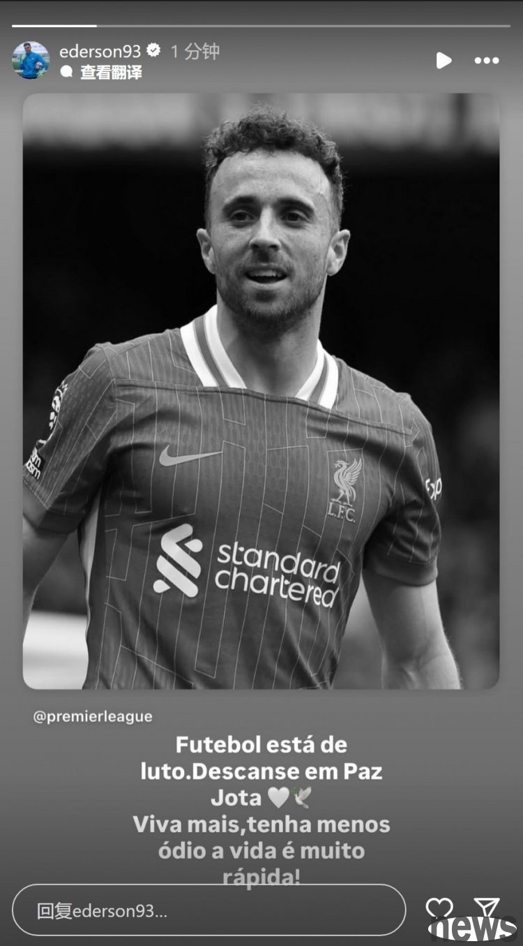 Liverpool striker Jota died in a car accident, and Manchester City goalkeeper Ederson posted a message to commemorate him. Ederson wrote: The world of football is immersed in grief, rest in peace, Jota. Life well, less hatred, life is fleeting!...