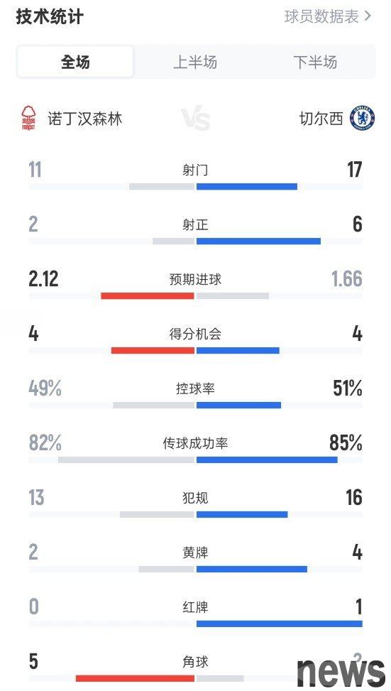 In the 8th round of the 2025-26 Premier League season, Chelsea 3-0 Nottingham Forest. The statistics of the whole game are as follows: Shots 11-17 Shots on target 2-6 Expected goals 2.12-1.66 Goal opportunities 4-4 Ball possession rate 49%-51% Pass...