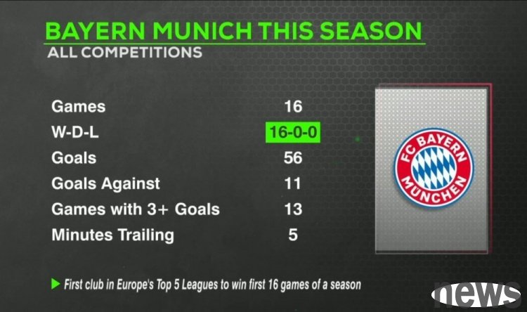Statistics show that Bayern has maintained a complete victory in 16 games in all competitions this season, scoring 56 goals and conceding 11 goals. Scored at least 3 goals in 13 games and trailed for only 5 minutes this season.
