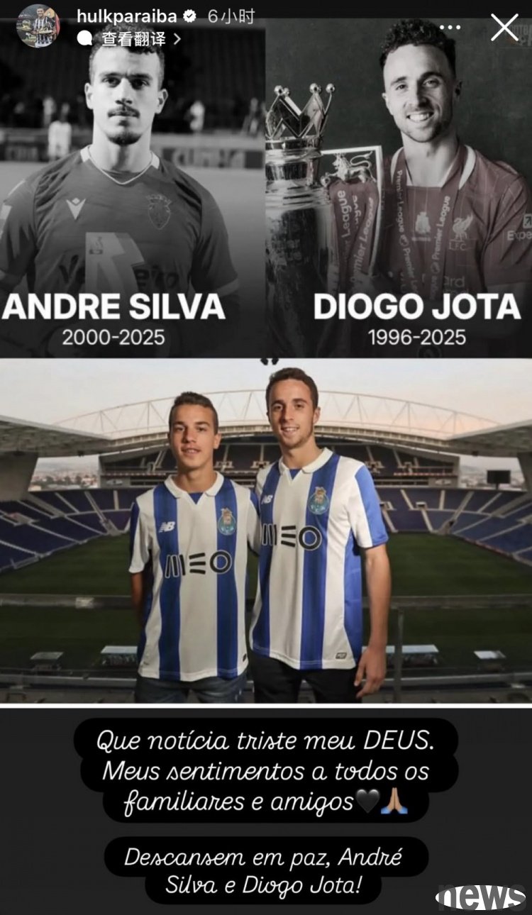 Liverpool striker Diogo Jota died in a car accident at the age of 28, and his younger brother Andre Silva died. Former Haigang foreign aid Hulk posted a photo of the Jota brothers in the past on social media and wrote to mourn. Hulk wrote: Oh my god...