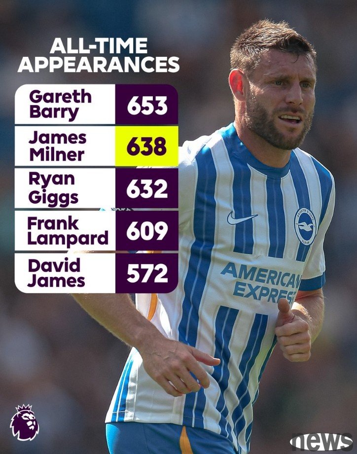 Brighton officially announced that he had renewed his contract with Milner for one year, and the Premier League officially also showed the league's historical appearances, of which Milner still had 15 games left.