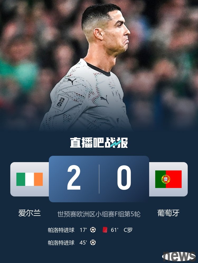 missed the chance to qualify early! Ten-man Portugal lost to Ireland for the first time 0-2. Ronaldo's retaliatory elbow attack caused him to get red