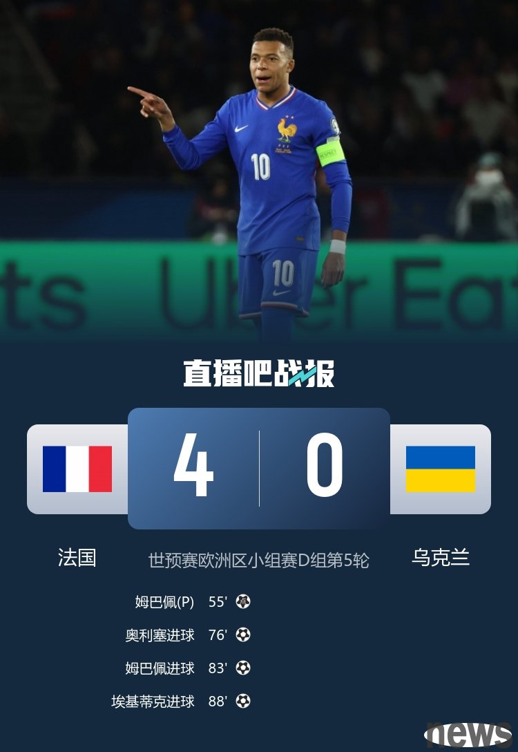 France 4-0 Ukraine advanced to the World Cup. Olise scored and created points. Mbappe scored 2 shots and 1 pass.