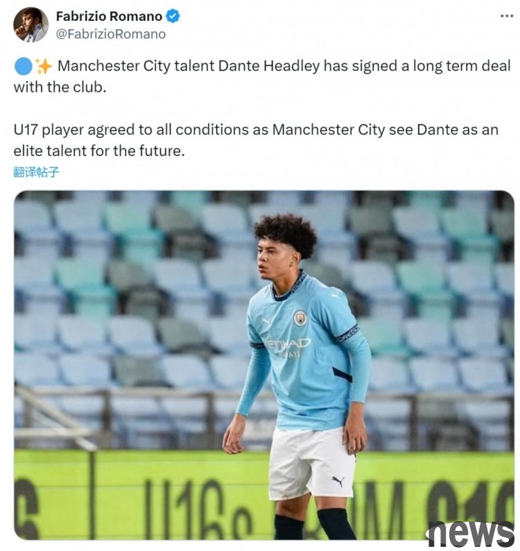 Romano revealed that England's 16-year-old young player Heidley has reached an agreement with Manchester City to sign a long-term contract renewal, and the club regards him as the top talent in the future.
