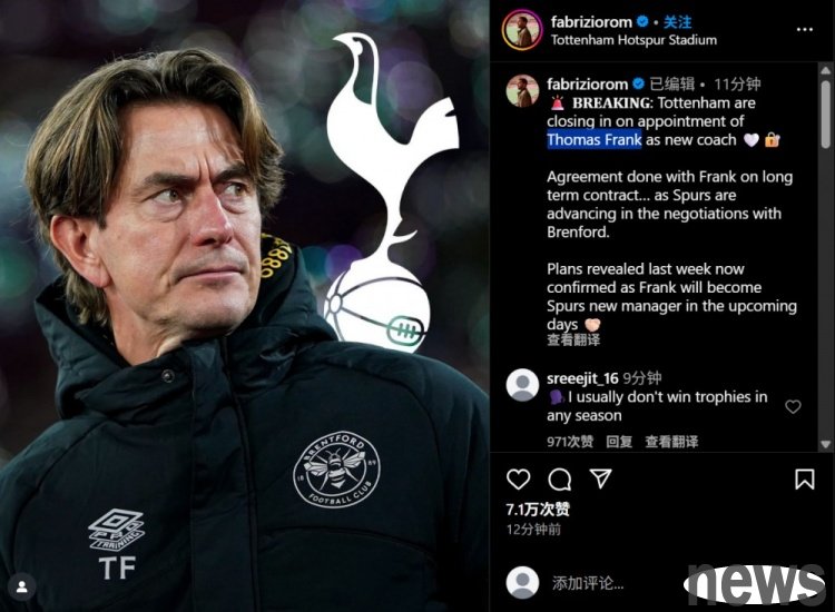 Tottenham reached an agreement with Thomas Frank on a long-term contract, the former making progress in negotiations with Brentford. The plan revealed last week has now been confirmed, and Thomas Frank will become Tottenham's new coach in the next few days.