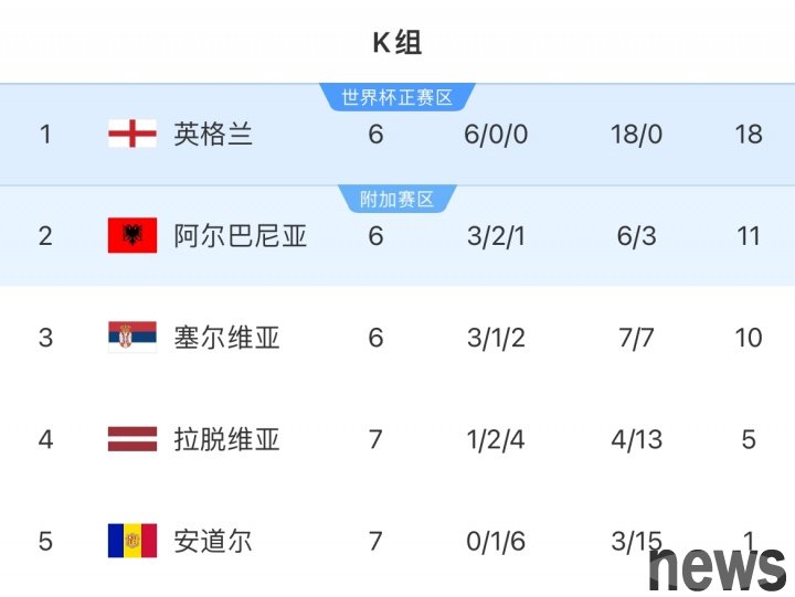 In the 8th round of Group K of the European Group Stage of the World Cup Qualifiers, England defeated Latvia 5-0 in an away game. They won all 6 rounds of the World Cup Qualifiers, scoring 18 goals but conceding 0 goals, locking in the top spot in t...