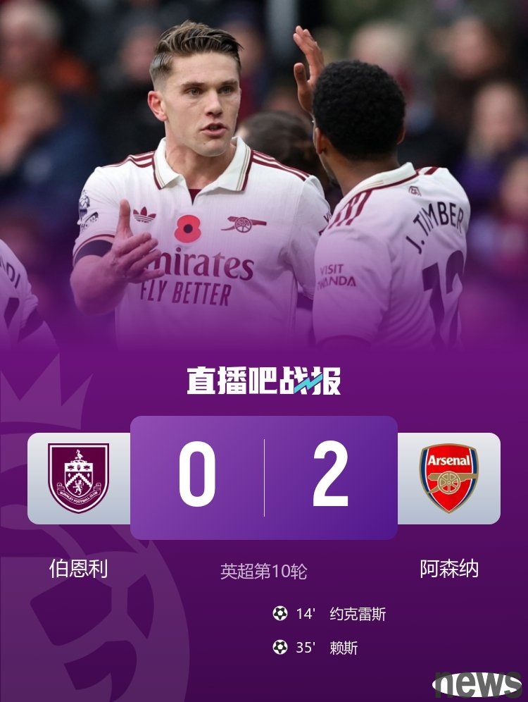 In the 10th round of the Premier League, Arsenal 2-0 Burnley away.